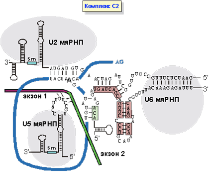 Рис. 9. Образование комплекса C2. Лигирование экзонов и полное выщепление интрона.