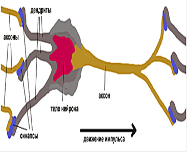 Нервная система и мозг человека состоят из нейронов, соединенных между собой нервными волокнами. Нервные волокна способны передавать электрические импульсы между нейронами. Все процессы передачи раздражений от нашей кожи, ушей и глаз к мозгу, процессы мышления и управления действиями - все это реализовано в живом организме как передача электрических импульсов между нейронами. Рассмотрим строение биологического нейрона. Каждый нейрон имеет отростки нервных волокон двух типов - дендриты, по которым принимаются импульсы, и единственный аксон, по которому нейрон может передавать импульс. Аксон контактирует с дендритами других нейронов через специальные образования - синапсы, которые влияют на силу импульса.
